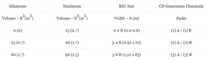 MCS CD Generation Chemicals Part A & Part B (25 of each). In order to figure out how many MCS CD Generation Chemical (packs) are necessary for one decontamination; Multiply the BSC volume by 0.13 g/ft3 (4.7 g/m3) to determine the mass of ClO2 required to be generated.
