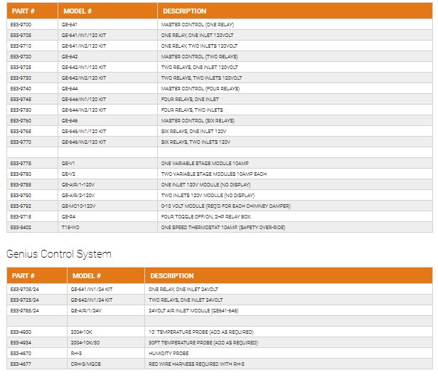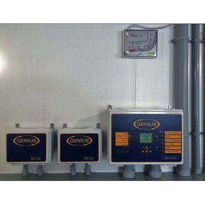 The Genius 6x Series can operate 1 to 4 variable stages by adding a GE-V1 module (1 stage variable) or 1 or 2 GE-V2 modules (2 stage variable). There are up to six 10amp relays, depending on the model chosen, that can be used for cooling, heating, heating pad, clock output, sprinkler or misting. One alarm relay and up to two 0-10 chimney dampers can be controlled by adding GE-MO10, 0-10v modules. The Genius Series can be ordered with an internal 120volt inlet board (in1/120kit) or a two inlet board (in2/120kit). All Genius models can operate up to two additional inlets by adding a GE-air/1 or a GE-air/2 inlet module (also compatible with VPM-2, VSM-2 and SVIM-1 inlet modules). Up to five 10k sensors may be used with one being designated for outside use.