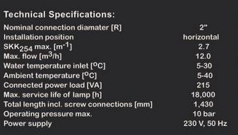 Electropolished stainless steel reactor, centered high intensity UV-lamp, 2 flushing/drain valves, 2 water meter screw connections, flow limiter, calibrated UV-C system sensor for automatic monitoring. Flow distribution device, control unit GENO -UV-Check with operating hour meter and switch-on counter, indication of the irradiation intensity in W/m-, voltage-free output for external operating and alarm signal, analog signal 4-20 mA for irradiation intensity and power output for connection of a safety valve (required for a DVGW-conform operation of the UV system).