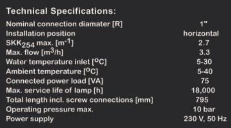 Electropolished stainless steel reactor, centered high intensity UV-lamp, 2 flushing/drain valves, 2 water meter screw connections, flow limiter, calibrated UV-C system sensor for automatic monitoring. Flow distribution device, control unit GENO -U V-Check with operating hour meter and switch-on counter, indication of the irradiation intensity in W/m`, voltage-free output for external operating and alarm signal, analog signal 4-20 mA for irradiation intensity and power output for connection of a safety valve (required for a DVGW-conform operation of the UV system).