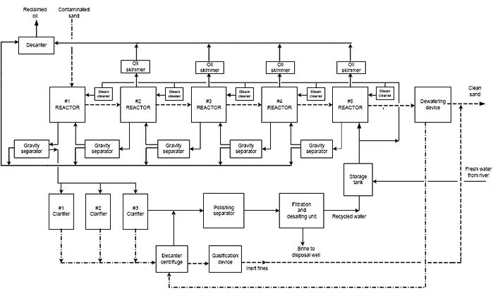 4. From reactor No.2, sand is conveyed downstream and similarly processed through reactors Nos. 3, 4 and 5. Sand is thus rendered progressively cleaner until it meets environmental standards. Clean sand is finally transferred to a dewatering device where it is suitably dried and rendered transportable to disposal sites.