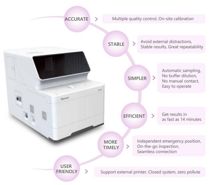 Genrui MT60 Chemiluminescence Analyzer is one of the world`s smallest, fully automated chemiluminescence immunoassay analyzers. Enhanced ALP-AMPPD method, it can achieve high detection sensitivity. It has a comprehensive test panel, including myocardium, inflammation, hormones, etc. MT60 is an efficient and convenient instrument, it can reach 86 tests per hour, the fastest result is 13 minutes, and the next result is displayed at an interval of 45 seconds. It has 27 sample positions, 9 reagent positions and 200 cuvettes. Not only that, its sample loading system is equipped with liquid level detection, anti-collision, cleaning, etc. design, which is very user-friendly.