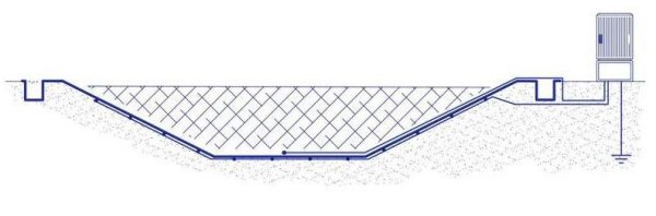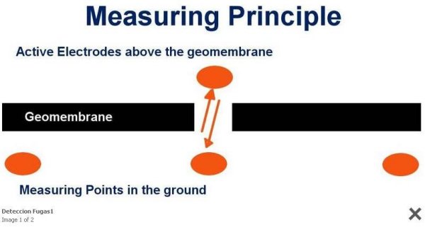System based on the low conductivity of HDPE eletric. Electrodes are installed below and above the liner, producing a potential difference. In the event of a leak, the electrical resistance decreases to almost zero, which is detected in a control box. The exact location of the defect was performed by the position of the electrodes, allowing a quick and inexpensive repair of waterproofing.