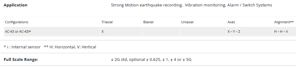 The AC-43 sensor package is a triaxial accelerometer designed for urban and industrial applications regarding strong motion earthquake survey and vibration monitoring as well as alarm and switch systems. All these applications require rugged sensors with minimum maintenance and a simple method for periodic testing.