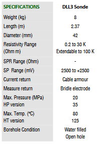The Dual Guard Focused Resistivity Probe (DLL3) measures both deep and shallow focussed resistivity, as well as spontaneous potential (SP) from the bridle electrode, it fias superior vertical resolution and depth of penetration than the conventional ELOG probe.