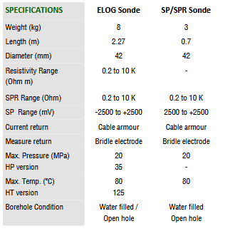 The SP measurement is a DC voltage measured in the presence of an AC current injected from the drive electrode. In certain circumstances, the SP is measured with reference to a surface electrode (Fish). The ELOG sonde requires a resistivity bridle for use which maintains separation between the drive electrode and the cable armour.