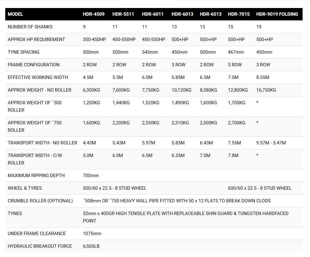 - The standard HDR range is available in 9, 11 and 13 shank configurations covering working widths of 4.5m to 6.5m