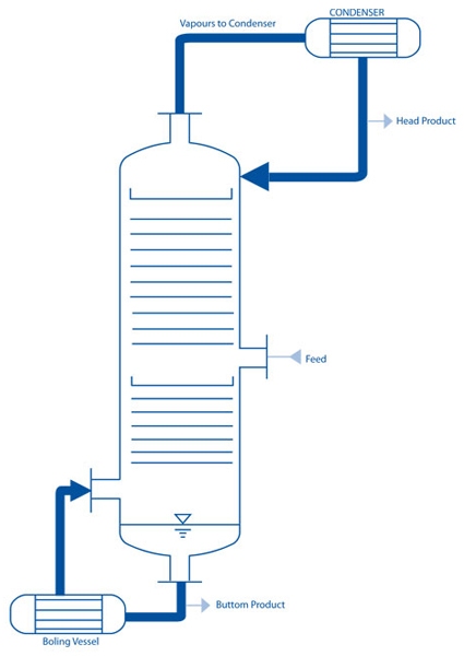 Rectification is a thermal separation process in which the more volatile components of a mixture are recovered and concentrated. The supply of thermal energy vaporizes the more volatile components and the ascending vapor phase comes into contact with descending liquid (reflux of volatile components). Part of the condensate is discharged as top product. The reflux contact normally occurs in trays or packages installed in a column. Increasing the number of rectification steps raises the concentration of the most volatile component. This means that the concentration of the low-volatile component is increased by forwarding of the top product of the first rectification column into a second column.