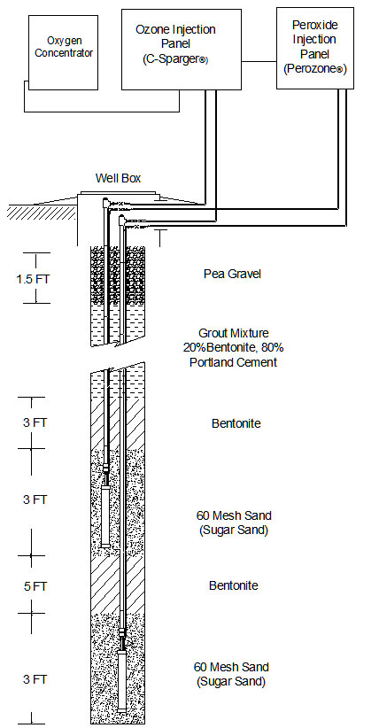 KTI’s Perozone® system creates peroxide-coated microbubbles using our unique injection process to greatly enhance destruction of targeted contaminants. Adding a small liquid injection panel to our C-Sparger® ozone remediation system enables co-injection of peroxide through our Laminar Spargepoints®.