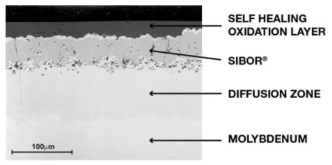 Molybdenum begins to oxidize at over 400°C. Sibor protects molybdenum from oxidation up to 1700°C (3092°F). The very hard, dense coating creates a diffusion barrier along the base material and forms an SiO2 seal against the air. Depending on the operating temperature, the material is protected against oxidation by the Sibor layer for up to 5000 h. Using Sibor, you can mount the electrodes right before heating the glass tank. This does away with the time-consuming and dangerous installation in the tank already filled with glass melt.