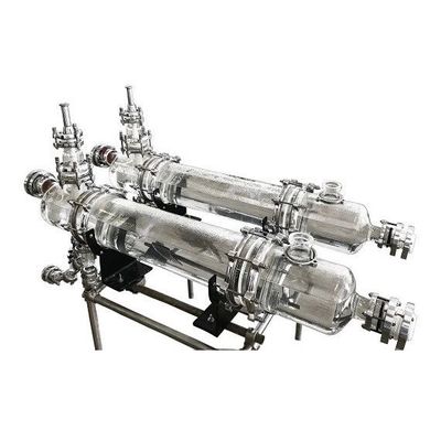 The mixing chamber consists of a cylindrical glass cover in which a variable speed stirrer drive is fitted. Glass impeller Stirrer creates a negative pressure at the inlet, which can be used to draw liquid from a previous stage in the process. In the mixing zone, a turbine stirrer with variable speed unit mixes the two phases and the mass transfer takes place during dispersion.