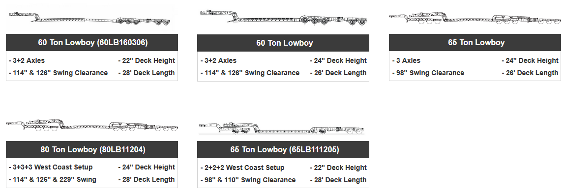 Lowboy Trailer: 3+2 Axles, 22" Deck Height, 114" & 126" Swing Clearance, 28` Deck Length.
