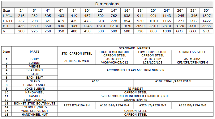 Design according to BS 1873, ANSI B 16.34. Bolted bonnet, O.S.& Y. Swivel disc. Full range of body and bonnet materials. Renewable seats. Rising Handwheel. Flanges according to ANSI B 16.5 from 2” to 24”. Flanges according to ANSI B 16.47 from 26”. Bw ends according to ANSI B 16.25. Face to face according to ANSI B 16.10.