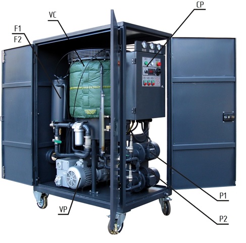 The station is assembled in a frame structure with closing doors. Its components are: a vacuum column (VC), a control panel (CP), pumps (P1 and P2), vacuum pump (VP), pre-filter, coarse (F1) and fine filter (F2), piping with valves.