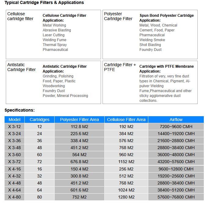 - Special designed deflector plates greatly reduce the dusts falling from top cartridges to down cartridges. This ensures longest cartridge filter life.