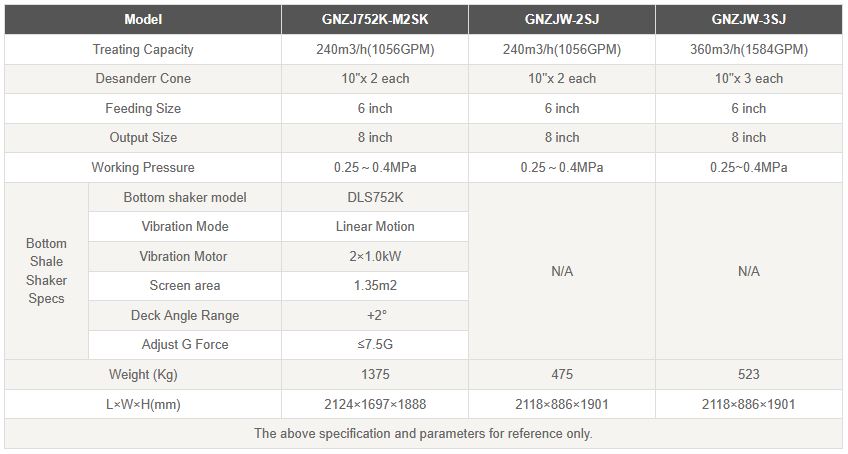 GN desander is the second class and the third class solid control equipment to treat the drilling fluid. According to the size of the cone diameter, it is divided into Desander and Desilter. Usually the cone diameter is more than 6″is called Desander, and used as the second-control equipment in drilling operation. We commonly used 8 "and 10" cones desander to separate solid-phase particle size 47-76μm in the drilling fluids.