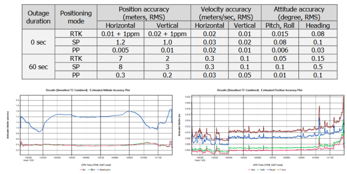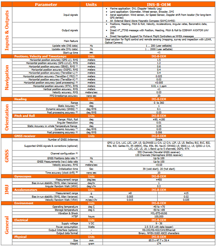 - High precision IMU (1 deg/hr gyroscopes and 5 micro g accelerometers Bias in-run stability) « GPS, GLONASS, GALILEO, BEIDOU, SBAS, DGPS, RTK supported signals