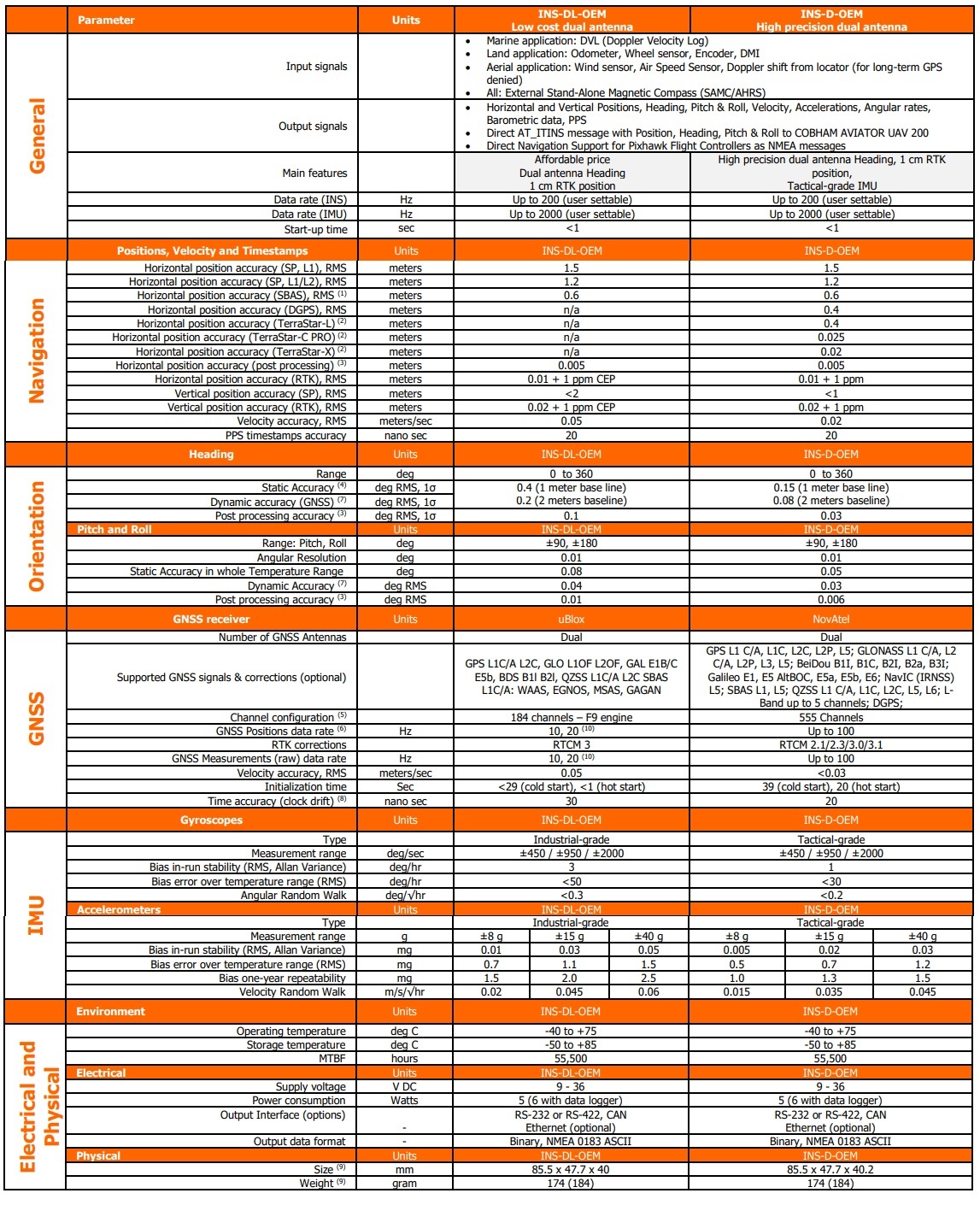 - Industrial & Tactical-grade IMU (1-3 deg/hr gyroscopes Bias in-run stability)