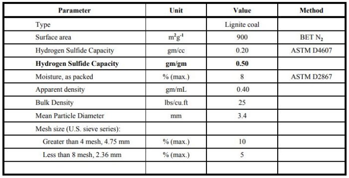 A granular activated carbon manufactured from high quality lignite coal specifically for odor control applications. The virgin activated carbon achieves its high H2S capacity due to its naturally inherent composition and the optimized activation that maximizes the desired porosity of the activated carbon.