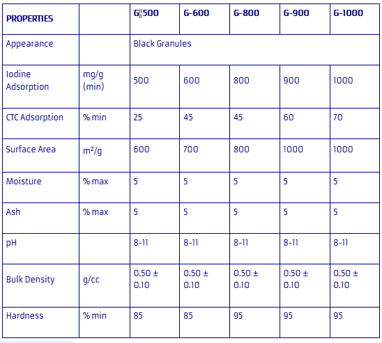 Granular Activated Carbon has a relatively larger particle size compared to powdered Activated Carbon and consequently, presents a smaller external surface. Diffusion of the adsorbate is thus an important factor. These carbons are therefore preferred for all absorption of gases and vapors as their rate of diffusion are faster. Granulated carbons are used for water treatment, deodorization and separation of components of flow system and is also used in rapid mix basins. GAC can be either in granular or extruded form.