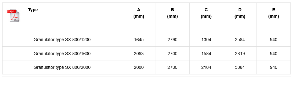 With a rotor diameter of 600 mm and 800 mm and with working widths of 1000 mm to 2000 mm and depending on the screen holes and type of feed material throughputs from 2 to 15 tons per hour with a driving power of the granulators from 90 kW to 315 kW can be achieved