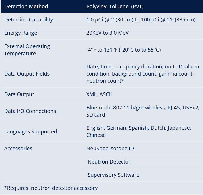 Options include neutron detection and Thallium doped Sodium Iodide crystal technology for isotropic identification.