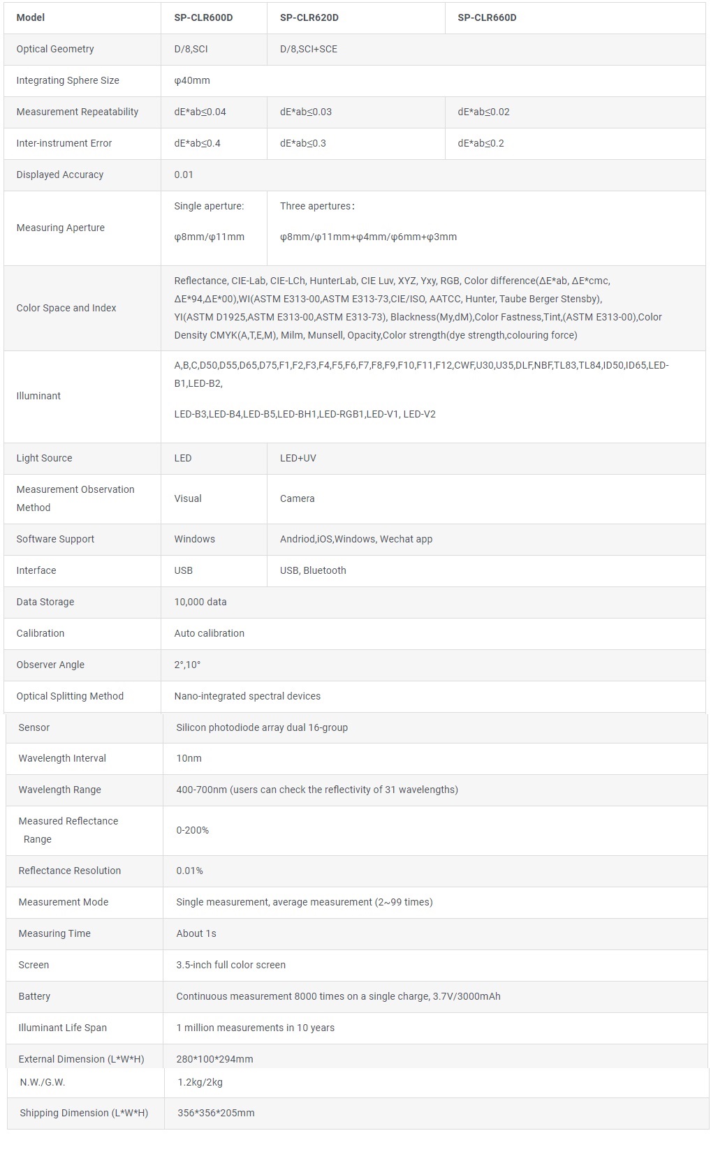 The spectrophotometers offer 30+ measurement indicators such as spectral reflectance, CIE-Lab, CIE-LCh, ΔE*ab, opacity, whiteness, yellowness, etc.;