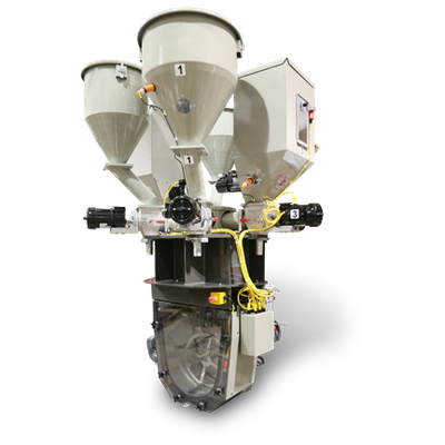 OA Series Gravimetric Batch Blending System features precision auger metering of all ingredients. OA blenders are perfect for applications that require multiple regrind materials or materials that are difficult to meter. Each OA blender features machined metering augers, precision load cells, cast aluminum feed auger assemblies and heavy-duty industrial design. The OA Series offers superior batch control and reliable feeding of difficult materials.