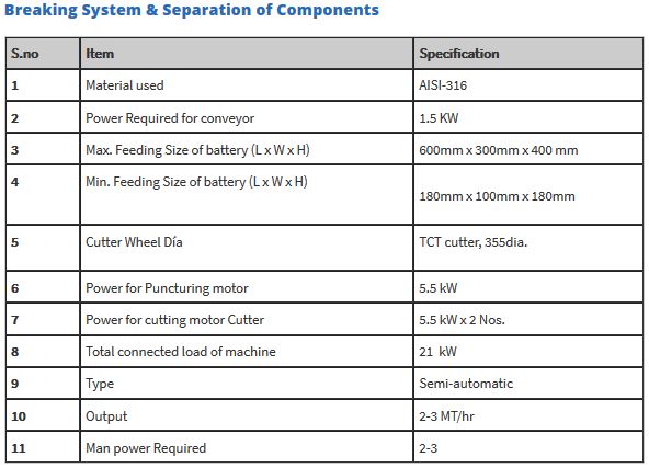 It is a rotating wheel type Semi-Automatic Battery Cutting Machine of standard capacity 2-3 MT/hr. Battery will be punctured from bottom through cutter to drain the acid water from battery. Metal Cutting Steel Blades rotating at high speed fitted on base frame structure. Forward movement of batteries against blade/cutting wheels is facilitated with SS 316 mounted on long base frame. To cut different height batteries motorized gear screw arrangement can simultaneously move these two cutting wheels up & down.