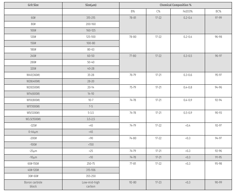 Boron carbide (chemical formula approximately B4C) is an extremely hard boron-carbon ceramic and covalent material. With a Vickers Hardness of >30 GPa, it is one of the hardest known materials, behind cubic boron nitride and diamond. Its Mohs hardness is 9.36, melting point 2350℃, density 2.51g/cm3. Boron carbide steel, jewel, hard ceramic and other hard materials, and to manufacture wear-resisting parts, metal cutting tools, nozzles and neutron-absorbing rods.