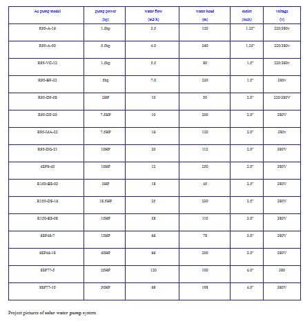 AC Solar water pumping system including ac water pump ,solar module ,MPPT pump controller ,solar mounting brackets ,dc combiner box and related accessories . Daytime , solar panel array provide power for the whole solar water pump sytem operating ,the mppt pump controller converts the direct current output of the photovoltaic array into alternating current and drives the water pump, adjust the output voltage and frequency in real time according to the change of sunshine intensity to achieve maximum power point tracking .