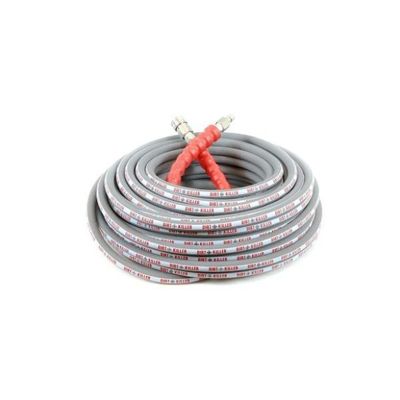 100’ Grey Non-marking Double Wire High Pressure Hose Assembly With 3/8” Stainless Steel Quick Disconnects Installed. 100’ non-marking high pressure hose assembly. Double wire grey wrap style Jacket hose with 3/8” MNPT Swivel Crimps installed. Red bend restrictors installed on each end. 6000 PSI Max Operating Pressure with 4:1 Burst Rating (24,000 PSI) . 225 maximum operating temperature, NOT rated for use with steam. Stainless steel plug and socket quick disconnects installed on each end.