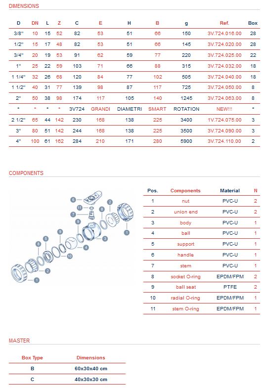 Grey PVC ball valve for industrial applications and processing plants, true union provided of adjustable support, round ball. EPDM or FPM seals, ball seats in PTFE. Operating pressure PN 16 at 20° C from DN 10-50 and 10 at 20° C from DN 65-100. Version BS standard (3V724) plain solvent weld socket; Available to be manufactured in other international standards (ASTM, JIS, NPT) upon request.