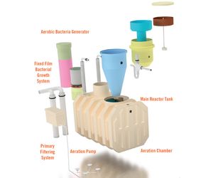 Grey water enters the aerobic bacteria generator chamber through the primary filter system where the aerobic bacteria generator, a system that is designed to promote fixed film bacterial growth in order to handle higher than normal levels of biomass in the wastewater, continue to break down and digest waste.