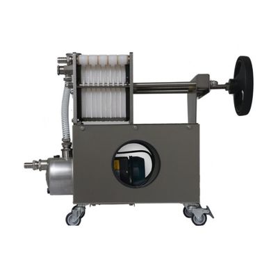 The pump and the structure are entirely made out of stainless-steel, which ensures high hygiene and durability; the plates for the filtering layers are made of linear nylon. This filter is designed for the use of 20 filtering layers, but it works with a lower amount, decreasing the hourly production. Equipped with a manometer for controlling the pressure and a valve for fluid control. The filter is easy to assemble and the layers are quickly replaced. Product waste is kept to a minimum. The machine is mounted on a stainless-steel cart with wheels and is complete of a liquid recovery tank.