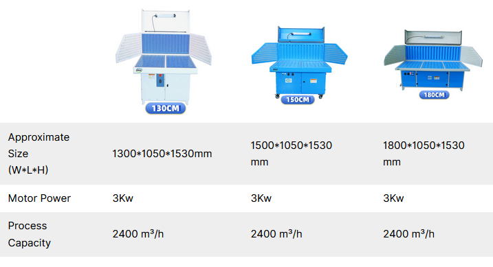 Grinding downdraft table utilizes a powerful downdraft or side-draft airflow to capture dust and debris directly at the source during grinding and polishing operations.