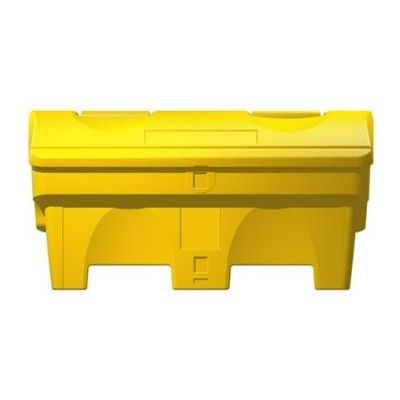 Extra strong lid with double skin edges. Optional hasp & staple. Personalisation label recess. Moulded-in grit salt sign. Stackable and easy to store. Optional gold banding. Fork-lift space for simple manoeuvrability. 200 litre capacity will hold 200kg of grit or salt.