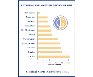 This is probably one of the most commonly asked questions. In most cases an estimated depth range can be determined with accuracy based upon the subsurface material and the frequency of the GPR antenna. For applications requiring higher resolution, such as locating rebar or conduits in concrete, a higher frequency GPR system (1,000 MHz) is used. This will give high resolution detail for down to approximately 24 inches in depth. Applications which require deeper penetration in ground soil requires a lower frequency (12.5 MHz to 500 MHz). Depending on the subsurface material the depth range can be from a few inches to thousands of feet (as indicated in the chart).