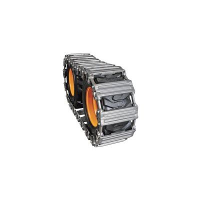 5` Wide Pad for improved floatation. Contractor grade, heavy duty components. Large 1-1/4` hardened, field replaceable bushings. Larger traction bars for improved track-to-tire grip. 2 built in traction bars. Patented open side plate for excellent clean out in the pivot area. Improved side wall design for today`s heavy duty tires. Built-in length adjustment. Run loose design. Self cleaning. Reduces tire wear in abrasive conditions. Adds counterweight. Provides tire protection. May be installed in 30 minutes or removed in 10 minutes. Field serviceable. Rebuildable. Reduces ground pressure by as much as 50%.