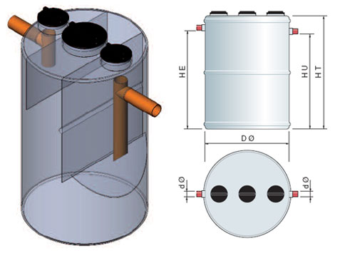 The Art. DEGP200-12000 Degreasers made by Eco Depurazione entirely in P.R.F.G (Glass-Reinforced Polyester) are monobloc vertical axis cylindrical structures sized for the pretreatment of waste waters coming from kitchens (refectories, restaurants, etc.) containing a high percentage of oils and greases.