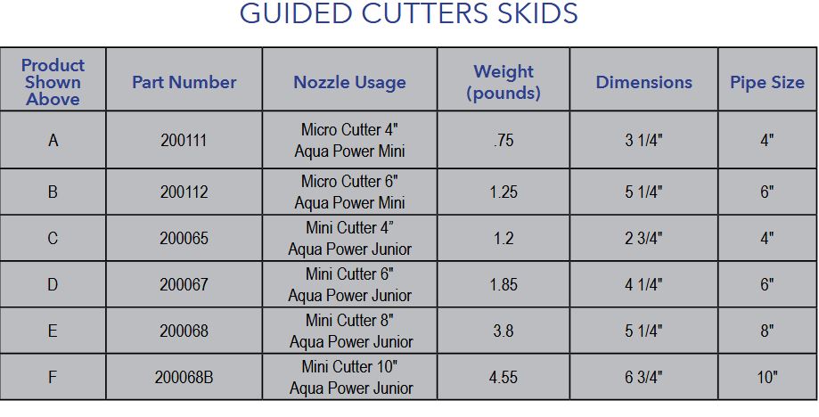 The unique, Guide Skid is designed for use with the Micro Chain Cutter, Mini Chain Cutter, Aqua Power Junior and Aqua Power Mini. The Guide Skid allows the nozzle to rest within the skid, which provides the nozzle to remain centered within the pipe, optimizing the water flow, cutting through pipe debris. Tight water pattern for efficient cleaning and pulling.