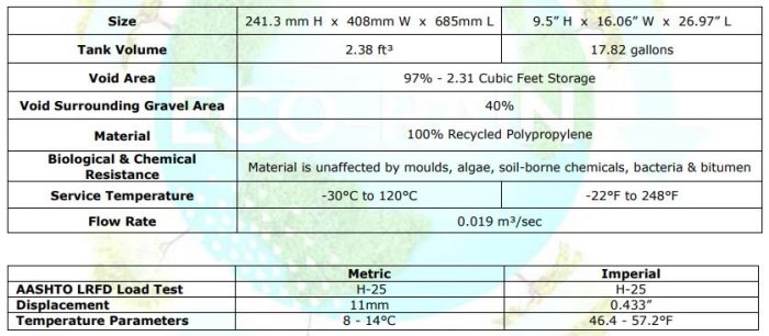 Tank Units: ET-1500 Half (1⁄2). Size in Feet: 0.79’ h x 1.34’ x 2.25’ . Size in Inches: 9.50” x 16.06” x 26.97” . Size in Millimeters: "241.3mm x 408mm x 685mm.