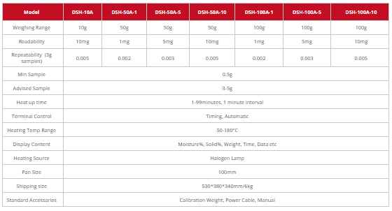 Halogen Moisture Analyzer 10g/50g/100g with RS232. Halogen moisture meter( also called moisture balance or halogen moisture meter) is a fast moisture detection instrument heated by halogen lamp.It can quickly and evenly dry the sample so as to obtain accurate moisture determination results and clear moisture determination information.10g/50g/100g weighing range and 1mg/5mg/10mg readability for your choice.