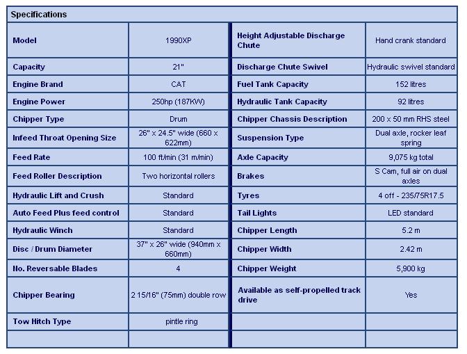 Bandit`s Model 1990XP is the ultimate hand fed chipper. With it`s 250hp CAT diesel engine, the Model 1990XP is ready to go to work to chip large, crotchy material. This unit is bigger and more powerful than the Model 1890XP, featuring an extra wide 26-inch wide drum that is 37-inch in diameter. The Model 1990XP is built with a feed system that is powerful enough to pull whole trees into the chipper. This heavy-duty feed system features a 15 3/4-inch diameter top feed wheel and 10 5/8-inch diameter bottom feed wheel. Both feed rollers are a super-sized 32 inch wide allowing the Model 1990XP to chip forked material that other chippers cannot process. The heavy-duty feed system and added width to the drum makes the Model 1990XP a real work horse, reducing the need for trimming branches. Ideal for big take-downs and crane jobs. The Model 1990XP is also available with a loader or a rubber-tracked undercarriage.