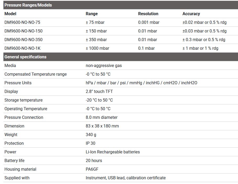 This hand held manometer uses piezo-restive sensor technology which ensure high precision, repeatability and stability over a wide temperature compensated range from 0 to 50ºC