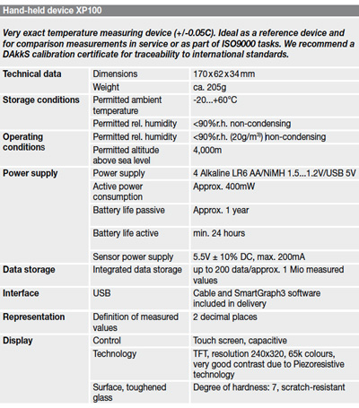 TFT LCD , anti-glare colour display. Capacitive touch screen. Sampling rate 1s. Data recording simultaneously on up to 3 channels. Graphical analysis including standard deviation. Integrated fl ash memory with space for up to 200 data blocks, or up to three hours continuous recording. USB port for data transfer to Smartgraph 3 (included in delivery). Multilingual interface. Numerous dimensions calculated. Online firmware update. High-precision hand-held device for PT100 temperature sensors. Suitable for measuring tasks requiring a high degree of precision. Mini USB port with software and online data collection. 25 languages available, precise to 0.05C. Solely for use with PT100 sensors.