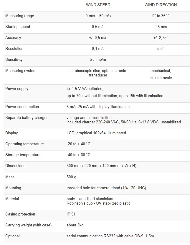 System for measuring wind speed is optoelectronic, with 3-cup Robinson’s cross and digital liquid crystal display. Wind speed is sampled in 1-second intervals. Four AA-type (R6) batteries located in a handle power the electronics. Automatic power-off circuit switches the instrument off, when cup assembly is not rotating for more than 4 minutes. As an option, wind speed data can be transmitted to the external device each second by RS 232 serial port (RVM 96B/T).