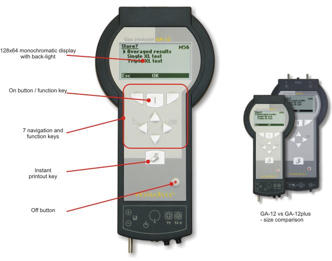 GA-12plus hand-held analyser that can be equipped with up to 4 EC cells. Larger cousin of GA-12 analyser that share very similar functionality and options. Thanks to larger housing fits more sensors, is equipped with Li-ion battery by default. Manufactured according to the principles of EN50379.