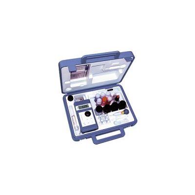 Photometer in carrying case (38x27x10 cm) with 4 glass cuvettes, 1 cuvette lid, 2 glass rods, 1 ball pipette, 3 sample flasks, 1 waste flask, 1 note pad, 1 waterproof pen and 4 batteries.