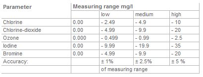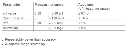 - Determination of free and bound chlorine, chlorine-dioxid, ozone, iodine, bromine, cyanuric acid, dissolved iron, dissolved aluminium and pH-value.